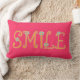 whimsical yellow font with blue flowers on a bright pink background spelling out the word Smile