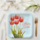 Spring paper plates with tulips. Pale blue colour plates with a bunch of red and white tulips with green leaves to decorate the centre. This big floral design will get you ready for warm weather and blooming flowers. Use for an Easter gathering, springtime birthday party, or for any reason. There is no wording to interrupt the pretty design. Plates come in round or square shapes, with other size options.