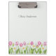 This elegant spring clipboard features soft pink tulips and white daffodils arranged in a classic garden border along the bottom. Set against a light, airy background and personalized with your name, it brings refined botanical charm to everyday organization.
