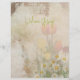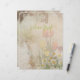 Tulips paper for a scrapbook page or junk journal. Distressed design with "Welcome spring" optional text. White wildflowers and colorful tulips decorate the bottom half as part of the background. Both sides are the same, except for the text which is on one side only, and can be deleted. A Bohemian style for carefree and casual writing, journaling, or creating a photo keepsake.