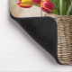Red and yellow spring tulip bouquet in a brown wicker basket