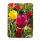 A beautiful variety of spring tulips at the Wooden Shoe Tulip Farm in Woodburn, Oregon. An up-close view of a pretty pink-purple tulip with other colourful tulips surrounding it. Photo taken April 2018.