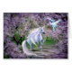 A delicately hued unicorn with lavender predominating in a similarly coloured blooming spring trees background and a fantasy bird celebration of spring greeting card