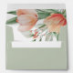 Spring bridal shower invitation envelope, featuring elegant peachy shades of orange in florals, tulips, botanical greenery on the inside and the outside of the envelope is green.