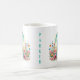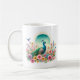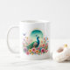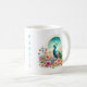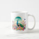Mug featuring a watercolor Peacock in a spring landscape. Customizable.