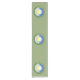 This altar cloth, or table runner, features the wheel of the year in the pale greens of Spring, spelling out the eight Wiccan Sabbats. In between each holiday is a graceful curling leaf. In the centre of the wheel, is a wreath with a half sun/half moon image representing the vernal equinox. Perfect for your Spring rituals. Ostara, Beltain, Litha, Lughnasah, Mabon, Samhain, Yule, and Imbolc are all represented here. Customize the background to any colour you desire.