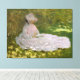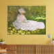Springtime by Claude Monet, oil on canvas 1872, is a landscape painting of a young woman in billowing white dress and white bonnet seated in the shade beneath a group of trees, reading a book. Around her the intense light of the warm spring sun breaks through the leaves of the trees, dappling the bright green grass and her dress with intense flecks of sunlight. Monet painted the image in quickly applied, loose brush strokes of oil colours, capturing a pastoral moment of repose of the woman amid nature. The range of values from light to dark and harmonies of green, brown, grey and white tones capture the light, colour and atmosphere of a scene painted from life.