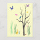 This postcard creates a colourful, whimsical spring mood. Birds are flying and are perched in the tree. Butterflies hover in the warm air. A duck waddles in the grass. There is even a tiny snail on the ground.