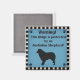 "Warning! This fridge is protected by an Australian Shepherd!" Featuring a silhouette of an australian shepherd on a blue background, surrounded by a black and white chequered border and black pawprints in each corner.