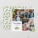 Square photo collage Christmas card with greenery twigs with white flowers and blue berries framing three photos of your family and Merry Christmas in dark blue.