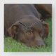 Sweet resting chocolate Labrador Retriever dog in a yard.