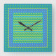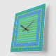 A square Wall Clock, with a 'Blue Moons' mix'n'match pattern of Chevrons and Polka Dots in Dazzling Blue, Neon Green, Turquoise and Emerald Green. Part of the Posh & Painterly 'Blue Moons' collection; from a handpainted paper collage design by Judy Adamson.