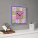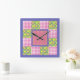 A pretty Square Wall Clock, decorated with a faux-patchwork pattern of deep pink, violet blue and yellow primroses on a leafy green background, with deep pink and white check gingham and polka dots; from the Posh & Painterly "Primroses" collection.