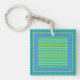 A square, acrylic Keychain, with a 'Blue Moons' mix'n'match pattern of Chevrons and Polka Dots in Dazzling Blue, Neon Green, Turquoise and Emerald Green. Part of the Posh & Painterly 'Blue Moons' collection; from a handpainted paper collage design by Judy Adamson.