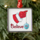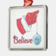 This whimsical square shaped design has a Santa hand with a blue ornament dangling from the end of a string. There is customizable text on the blue ornament for you to add the year. Additional colourful text reads: "Believe". This design makes a great gift for "believers" of any age!