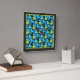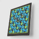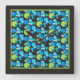 A pretty, square Wall Clock with a 'Blue Moons' abstract pattern in bright blues and neon green on a black background; from a handpainted paper collage design by Judy Adamson.
