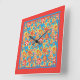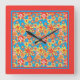 A pretty, square Wall Clock with an all-over pattern of red, orange, yellow flowers on a bright turquoise background and a Scarlet border, from a handpainted paper collage by Judy Adamson.