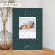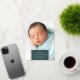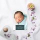 Chic and modern birth announcement features a single full bleed vertical/portrait oriented photo with a rectangular banner element at the bottom, bearing baby's name, birthdate, and birth stats, and trimmed with silver foil. Add a personal message to the back, along with an additional photo.
