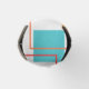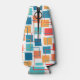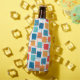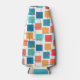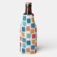 This bottle cooler has a geometric design of squares in tangerine, poppy, coral, and shades of teal scattered about with their outlines.