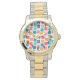 This women's watch has a geometric design of squares in tangerine, poppy, coral, and shades of teal scattered about with their outlines.