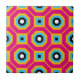 Unique ceramic tile featuring a seamless pattern composed of geometric shapes in teal, yellow, black and yellow on a pink background.