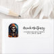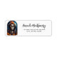 Étiquettes de adresse avec l'illustration d'un squelette portant une veste à capuchon avec un casquette de sorcière orange sur le dessus. Entouré de citrouilles mignons et éffrayants. Une lune brillante dans le dos avec une seule chauve-souris volant à proximité. Fun automne design Halloween.