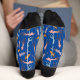 Three cute squid cartoons and a triton sea shell. Seamless pattern. Custom background colour. Custom top stripe colour. Custom text on each sock.