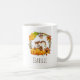 Personalized mug with a cute squirrel standing behind some orange watercolor pumpkins. A foliage wreath surrounds them with an oak leaf and orange flowers and other sprigs and leaves.