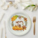 A paper plate with a cute chipmunk standing behind some orange watercolor pumpkins. A foliage wreath surrounds them with an oak leaf and orange flowers and other sprigs and leaves. Background is a faux vintage parchment in a cream colour, with a rough aged look.