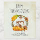 Happy Thanksgiving bottle labels. With a cute squirrel standing behind some orange watercolor pumpkins. A foliage wreath surrounds them with an oak leaf and orange flowers and other sprigs and leaves. Background is a cream colour, with a rough aged look around the edges.