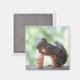 Photo of a squirrel eating an ice cream cone outside on the wooden railing of a back deck. The squirrel is licking a fake cone with what looks like strawberry ice cream...or maybe it's peanut flavoued ice cream! A lovely soft green background of evergreen trees contrast with the pink ice cream cone. A funny squirrel picture that anyone who love squirrels or ice cream would enjoy!