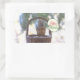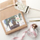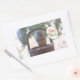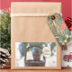Photo of a fat squirrel sitting on a basket in the falling snow saying "Merry Christmas" in a speech balloon. Snow is piling up in this winter picture with a white background of fallen snow and the green branches of evergreen trees. "Merry Christmas" is written in red and red script. This photo of a squirrel in winter can be customized and printed on many different photo products.