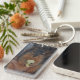 A keychain featuring two photos of a squirrel eating an apple.