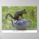 Photo of a squirrel sitting on a white and blue ceramic teapot with Japanese writing and fish designs. The caption reads, "Learn to enjoy the finer things in life". This picture is from my "Life Lessons from my Squirrel Friends" calendars and books. It's a great picture for any squirrel lover or tea lover!