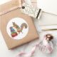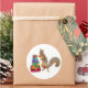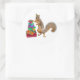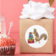 A squirrel with a party hat stands with a pile of presents. This fun birthday sticker would make a fun gift tag .