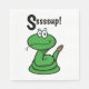 Funny green cartoon rattle snake. He has big oval eyes with raised eyebrows. A cheeky grin with his tongue sticking out. His long coiled body has a rattler on the tip of his tail. Over the snake in black lettering is a play on the word Sup! reading Sssssup!