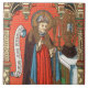 St. Alphonsus Maria de Liguori (1696–1787) was an Italian nobleman, a lawyer turned priest, prolific writer, founder of the Redemptorists, Bishop, and Doctor of the Church. Here, in a chapel setting against a red brick background, he stands wearing his Bishop’s robes—mitre and cope—and carrying his crosier or pastoral staff. His right hand is raised in blessing. In art, when portrayed at an angle to the viewer as in this image, he has a noticeably humped back and a chin tucked into his chest. In May 1768, he had been struck with a terrible attack of rheumatic fever that lasted over a year and left him permanently crippled until his death some twenty years later. For this reason, he is patron saint of rheumatoid arthritics and the aged ill. + Feast: August 1 + Image Credit (SAU 039): Antique image of St. Alphonsus Liguori from a late 19th-century devotional print in chromolithography, originally published by Socièté de St. Augustin, Bruges, Belgium, from the designer’s private collection of religious ephemera.