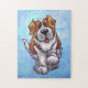 Animal Parade Cute St. Bernard Dog Puzzle with Gift Box created by Imagine That! Design features our cute tan and white dog character standing in a grassy yard with a red brick fence, a textured blue sky and a playful wavy purple border painted by our talented children's book artist, Traci Van Wagoner. The fun pup stands in play position with one paw raised. This fun pet art is perfect for St. Bernard dog lovers and humourous animal art lovers of all ages. On many of our whimsical St. Bernard doggy products you'll find this cute puppy coming and going with the playful Saint Bernard dog's head on one side and the funny dog's tail on the other. Join the Animal Parade and bring a smile to the face of someone you love with a gift of our cute St. Bernard dog. Woof!