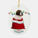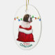On the front of this Holiday ornament is an image of an adorable Saint Bernard puppy in a red and white Christmas gift bag. Behind the dog is a string of colorful Holiday lights. The text at the bottom says "Merry Christmas". The back of the ornament has the same image with a custom name field.