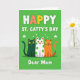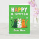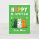 This card shows three stylized cats sitting upright in a neat row on a solid emerald green background, their front-facing pose giving the scene a friendly, balanced look 💚. The left cat is deep forest green with bright yellow eyes and a small pink smile, as if it’s leaning in to join the group photo. In the middle, a white cat is covered in chartreuse polka dots, its matching yellow eyes and rosy snout adding a sweet, close-knit feel between the three. On the right, an orange cat completes the trio, its simple shape and cheerful face making it feel like the warm friend who always rounds everyone up. Across the top, the phrase “St. Catty’s Day” appears in large letters with a mix of white, coral, and golden yellow, and small white shamrocks sit nearby as a nod to St. Patrick’s Day ☘️. Near the bottom, “Dear Mom” is written as a direct address, set below the cats so it reads like a note tucked under their paws. The overall look stays flat and graphic with strong color contrast, and the shamrocks and text float above the cats against the green field.