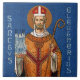 St. Eleutherius was a sixth-century prelate, the first bishop of Tournai. He evangelized the pagan Franks of the region, then Gaul now Belgium. He vigourously argued against Arianism, a rampant anti-trinitarian heresy of the time that denied the divinity of Christ and asserted that Jesus was created by and not of the same substance as God the Father. According to tradition, St. Eleutherius was a martyr: he was set upon by a group of Arians as he left his church, beaten, and left for dead; he died some weeks later of the wounds he sustained in the attack c. 532. + Here, St. Eleutherius--like any other bishop saint--is dressed in episcopal robes and holds a crosier, symbol of his authority. His distinguishing attribute is the five-spired cathedral that he holds in his right hand. The cathedral model is readily identifiable by its spires as the present-day Cathedral of Our Lady (in English; Notre-Dame de Tournai in French; and Onze-Lieve-Vrouw van Doornik in Dutch). Begun in the 12th century long after the Saint’s demise, the building rests on much older foundations and combines features of three distinct styles and construction phases: the Romanesque, the Gothic, and the French Baroque. Today, the Cathedral houses relics of St. Eleutherius in a gabled silver and gilded copper chest adorned with sculptures in very high relief. The reliquary shrine was commissioned by Bishop Walter de Marvis of Tournai, and completed in 1247, on the occasion of the retranslation of the Saint’s relics. It is one of the masterpieces of Gothic metalwork. + Feast: February 20 +