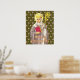 St. Etheldreda (or Audrey; c. 636-679) is one of the most popular medieval English saints in Britain. She was born an East Anglian princess, became Queen of Northumbria, and died a nun. Widowed once and married twice for reasons of State, nevertheless, she remained a virgin. When her second husband began to press for his marital rights, she sought the counsel of St. Wilfred, Archbishop of York, who advised her to become a nun and abetted her vocation. She made her vows at Coldingham in 672. In the ensuing years, she founded a great double monastery for both men and women at Ely, Cambridgeshire, over which she presided as abbess. In little more than four centuries, in 1109, the site of her abbey at Ely would be constituted a Cathedral. She died of a painful throat ailment in 679. + Here, St. Etheldreda (Audrey) is depicted as abbess, having laid aside her royal robe with its ermine lining, scepter, and secular crown which appear on the floor at her feet (not visible in this detail). She now wears a rayed crown tipped with stylized flowers. In her right hand, she holds a book; in her left, her abbess’s crosier with its sudarium or ‘sweat cloth’ used to prevent discoloration of the staff’s metal shaft by a sweaty palm. Ordinarily, she holds a model of Ely Cathedral and a budding rod or lily of purity. + Feast: June 23 + Image Credit (P 003): Detail of an antique image of S[t].Etheldreda.A[bbess].V[irgin]. from a late 19th-century devotional print in chromoxylography, originally published by Friedrich Pustet, Regensburg, New York, and Cincinnati. From the designer’s private collection of religious ephemera.