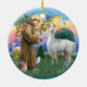 Saint Francis, the patron saint of animals and the environment, is shown here in this beautiful scene with a llama , along with a lamb, rabbit and dove of peace.