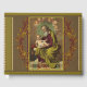 Vibrant traditional Catholic image of St. Joseph sitting with the Baby Jesus with angels adoring. A decorative branch border surrounds them.