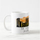 Coffee mug design features St. Louis Missouri city skyline silhouette with sunset watercolor splash background and latitude & longitude map coordinates.