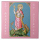 According to tradition, St. Margaret (or St. Marina the Great Martyr) laid down her life for Christ during Diocletian’s persecution at the beginning of the fourth century. Though a famous virgin martyr, ironically she is patron saint of expectant mothers and women in labour. The devil in the guise of a dragon, as this unusual patronage’s origin story goes, swallowed her whole. However, the cross she was carrying so irritated the dragon’s innards that he either egested her or ruptured to be rid of her. While even Medieval popes and hagiographers deemed this story fanciful, nevertheless, it was embraced by the laity and by artists if only for its symbolism. And, the cross and the dragon have been her principal attributes ever since. + This image of St. Margaret is particularly fetching. The saint, whose beauty was legendary, stands on the back of a large green dragon that tugs at her cloak with its teeth. She is crowned with a garland of roses, her long blonde hair flowing over her shoulders. She wears a bright pink mantle over a white tunic against a blue background patterned with little white dots and stars. + This product line emphasizes St. Margaret’s patronage of pregnancy and childbirth. The dominant pink and blue colour scheme ties in well with the modern custom of using these colours for girl and boy babies. The mantle’s golden yellow lining allows for a gender-neutral theme. + Feast: July 20 +