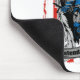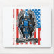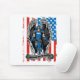 Mouse pads for police officers. St. Michael is the patron saint of law enforcement and here he holds a police baton in each hand. Handcuffs hang from his belt with an American flag background. Religious police officer computer mouse pad. Police across his chest and large angel wings. Defend Us in Battle banner. Police officer mouse pad.