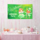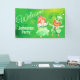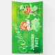 A wee leprechaun couple are dancing a jig – red hair shining around their pointed ears. Their green clothing is leprechaun perfection down to their golden dancing slippers. The background is appropriate greens with floating/dancing shamrocks. The inscriptions of "Welcome" and "Johnston Party" in a pale green can be changed for your event/restaurant/pub.