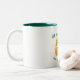 This St. Patrick's Day mug features a festive shamrock green and gold theme. The image features two beer mugs on either side of a leprechaun hat filled with four leaf clovers. A golden lucky horseshoe frames the image.