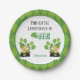 Celebrate your little one's first birthday with this Irish themed party paper plate featuring leprechauns lounging on pots of gold with shamrock balloons on a green argyle pattern background. Easy to personalize with custom options.